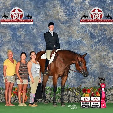 Thank you for looking at our page of Adele's career. In summary, Adele, (Blue Boys Fair Lady (2016 ApHC, NSBA, PtHA Filly)) came to Top Spot in November 2018 as Jocelyn's NonPro horse. Adele had many National and World titles (see below) before we owned her, and she has been successfully shown since at the CBCongress, Nationals and Worlds since we have owned her. In 2022 she also went to local shows and a small country fair, and she handled it well.